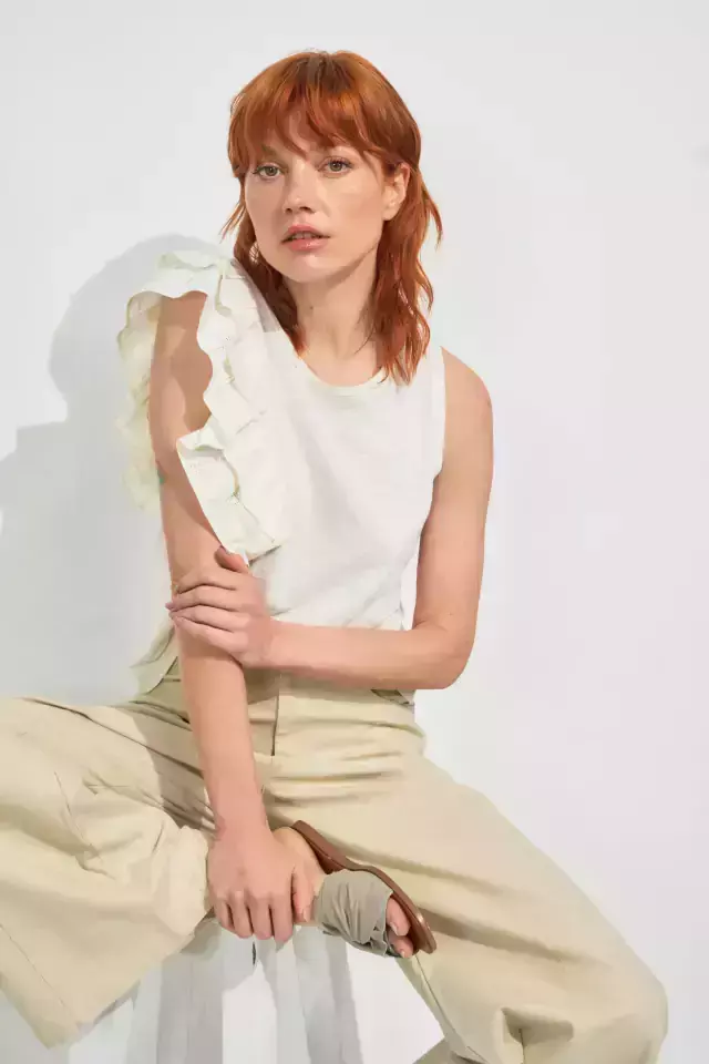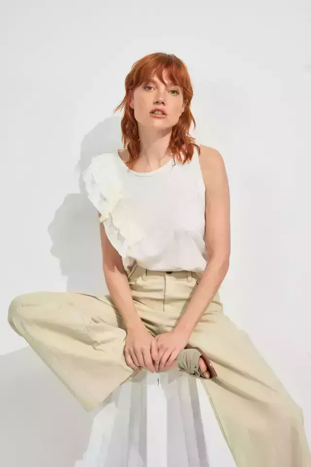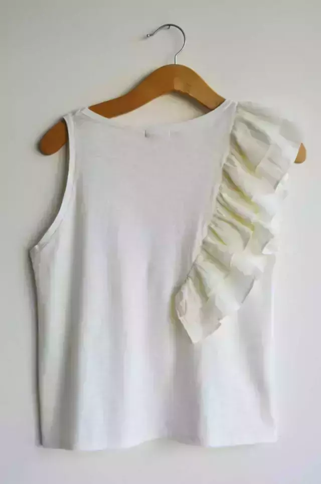 Remera confeccionada en algodón pima flame, calidad Premium como siempre. Escote a la base. Doble volado irregular en Rattier. Silueta al cuerpo. Largo a la primera cadera. Esta remera se convirtió en un clásico de Denari Rodriguez. Canchera, única, completa tus outfits dando un toque sofisticado.