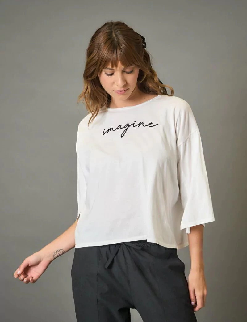 Descubre la comodidad y el estilo de nuestra Remera IMAGINE, confeccionada en algodón suave y liviano. Su silueta oversize y escote redondo la hacen perfecta para cualquier ocasión. El bordado en el delantero añade un toque distintivo, mientras que las mangas cuadradas con tajo aseguran una mayor libertad de movimiento.