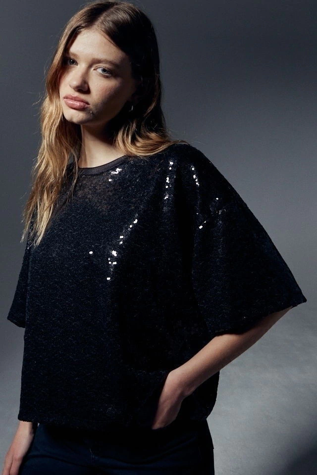 Remera de lentejuelas calce oversize, detalle personalizado en espalda.