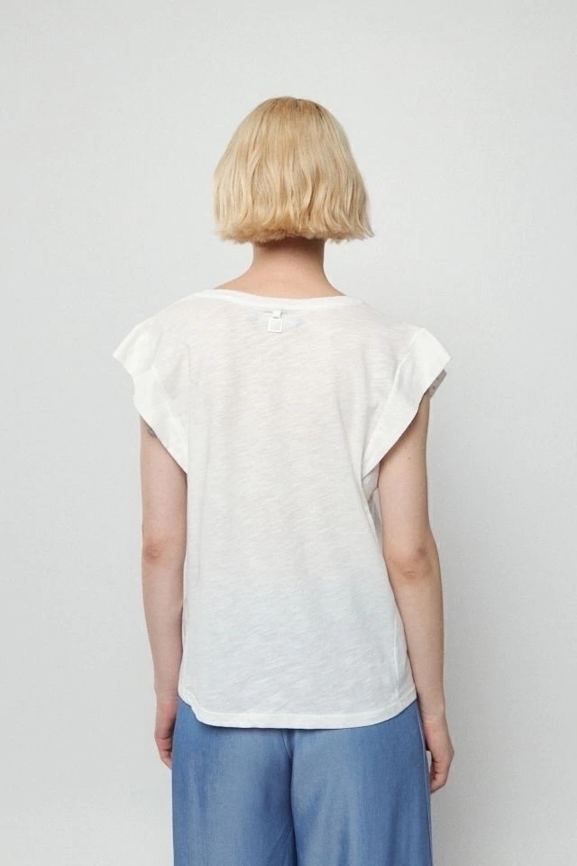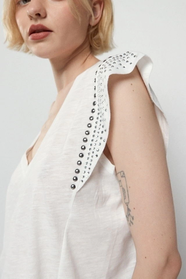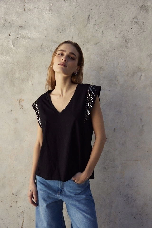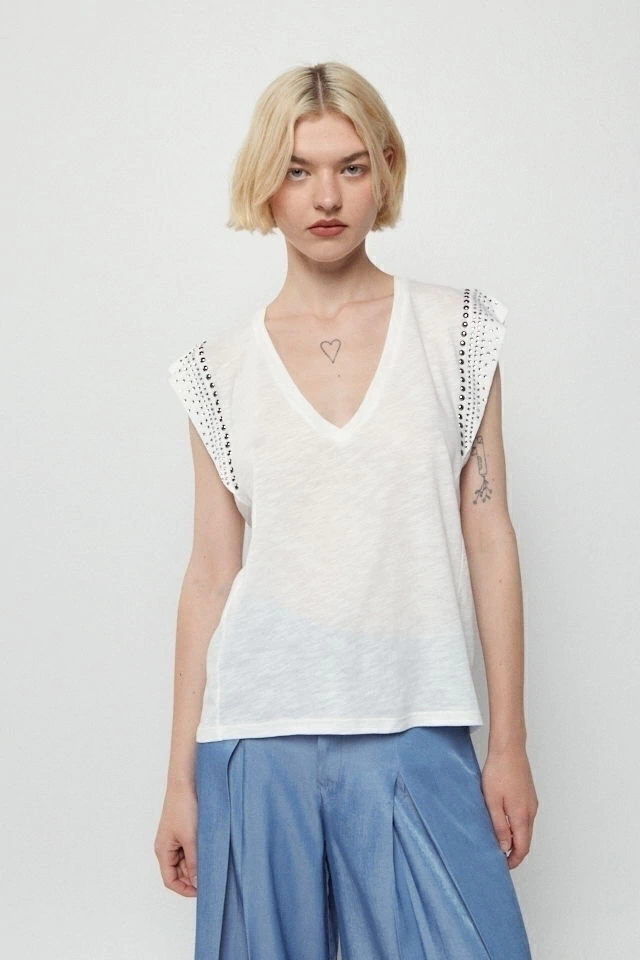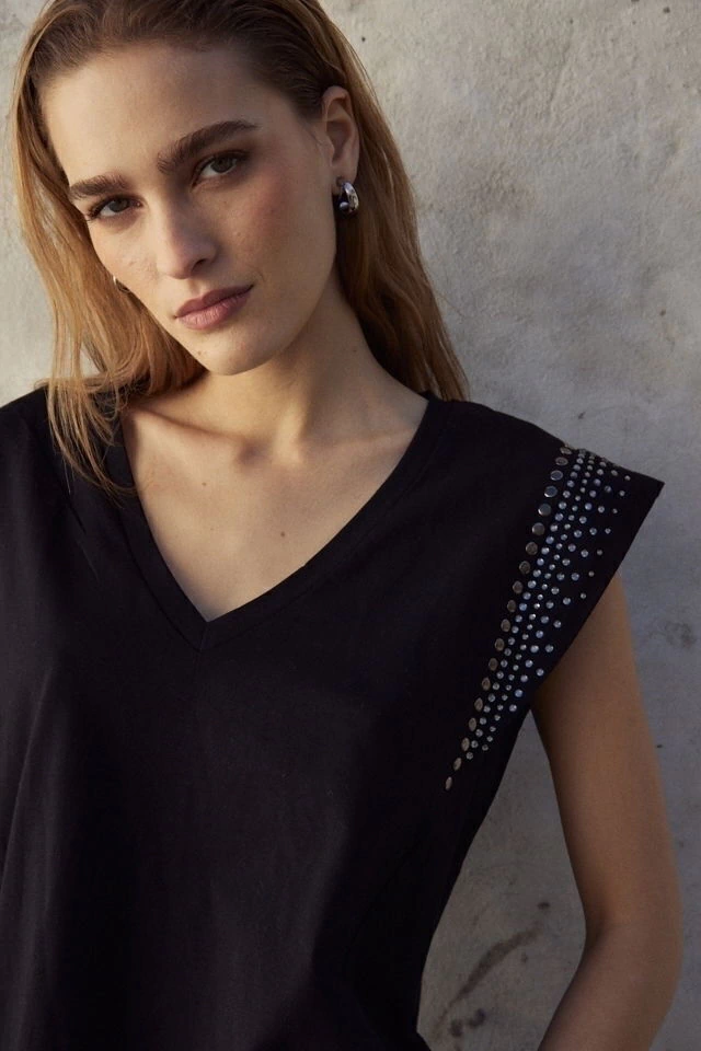 Remera con hombros prolongados y escote en V, apliques en hombros.