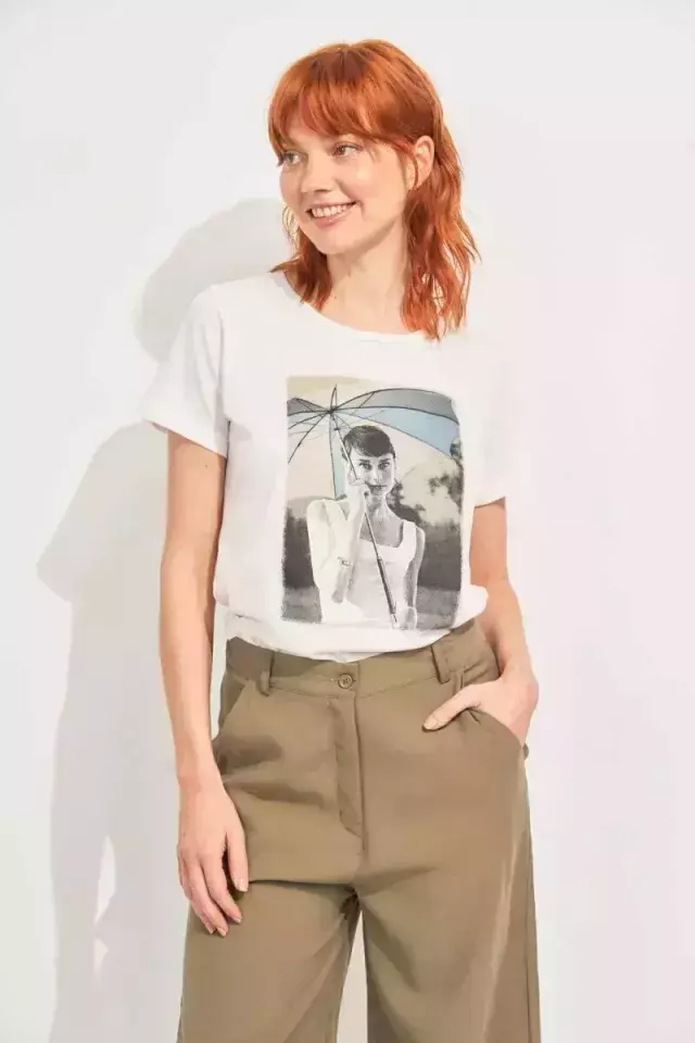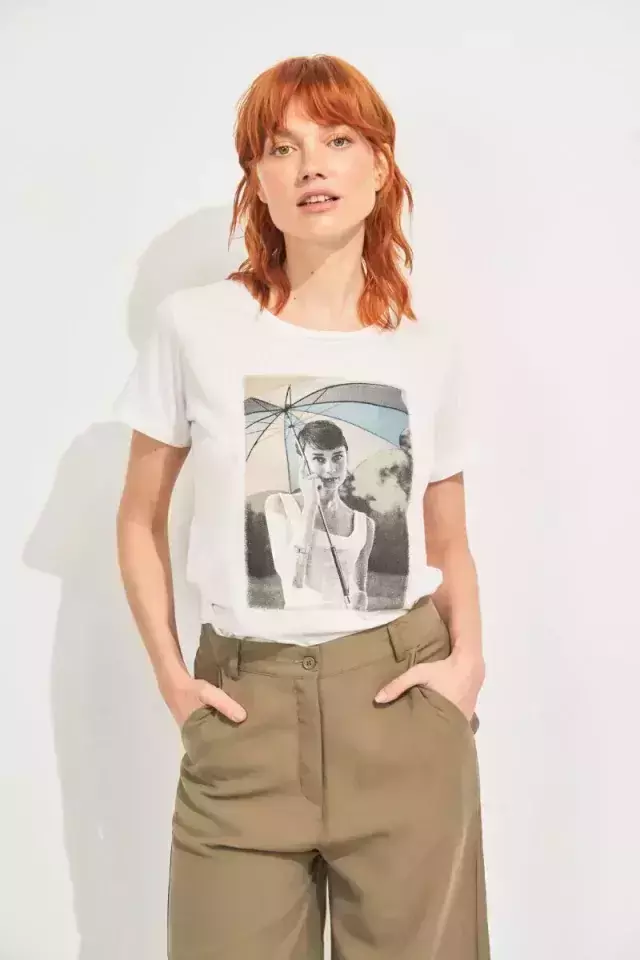 Remera confeccionada en algodón pima de excelente calidad. Escote a la base, manga corta. Silueta recta. Largo a la primera cadera. Estas remeras con estampas de iconic girls se transformaron en un clásico para Denari Rodriguez. De calce perfecto y súper cancheras no te pueden faltar. Tabla de Medidas: